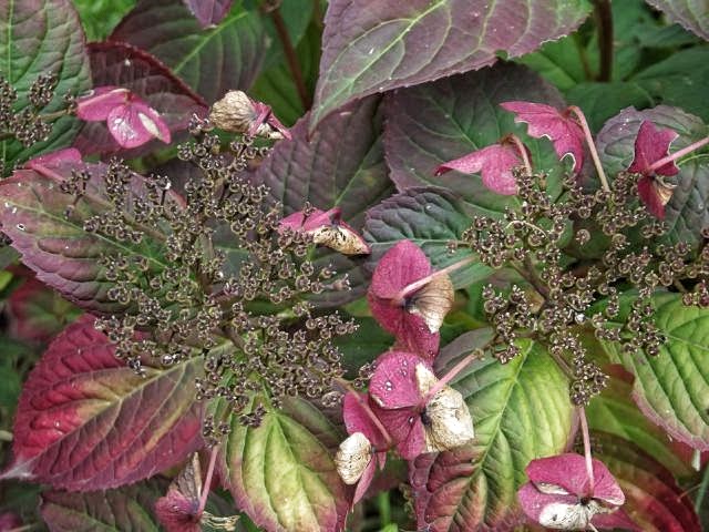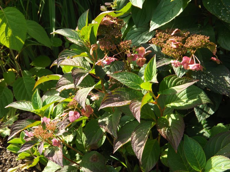 Hortensja piłkowana (hydrangea serrata) 'Santiago' zjawiskowo się przebarwia.