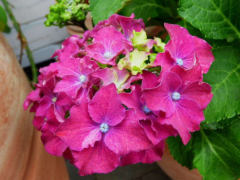Kwiaty: nietypowe, bo zbudowane z płatków o falistych brzegach - wyglądają jakby były postrzępione - skupionych wokół wypukłego, niebieskiego oczka... zebrane w duże, różowe lub fioletowo niebieskie (w zależności od pH podłoża) kwiatostany o wielkości około 20-25 cm... kwitną od czerwca do września
