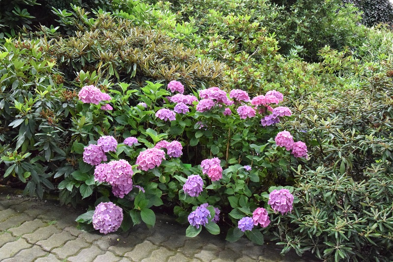 Kwiaty: kuliste, duże, o średnicy do 20 cm, zbudowane ze sterylnych (płonnych) kwiatów w kolorze niebieskim, niebieskoróżowym lub lawendowym (w zależności od kwasowości podłoża - im kwaśniejsza ziemia tym kolor bardziej przechodzi od różu do niebieskiego). Kwitnie od czerwca do września na pędach dwuletnich (uwaga, nie wolno przycinać na wiosnę!).