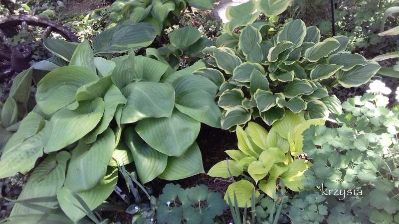 Choć w tym roku majowe przymrozki nas ominęły to moje hosty przypaliło już :slonko , dziś po raz pierwszy od nie pamiętam kiedy spadł deszcz. Wczorajszy wiatr strącił mnóstwo szyszek, na szczęście wiał od wschodu i najwięcej spadło już za płotem, ale wiele host ma już podziurawione liście.