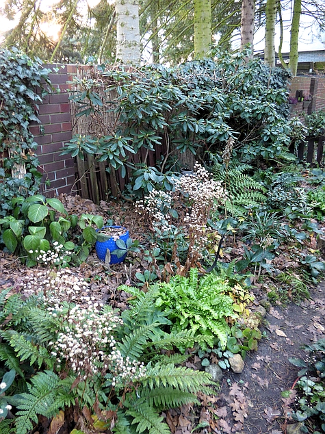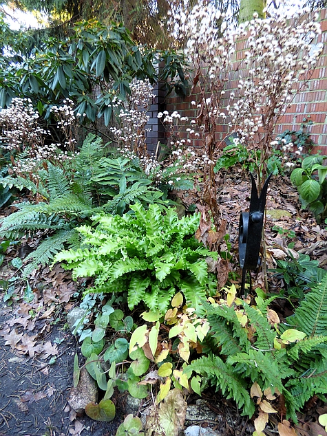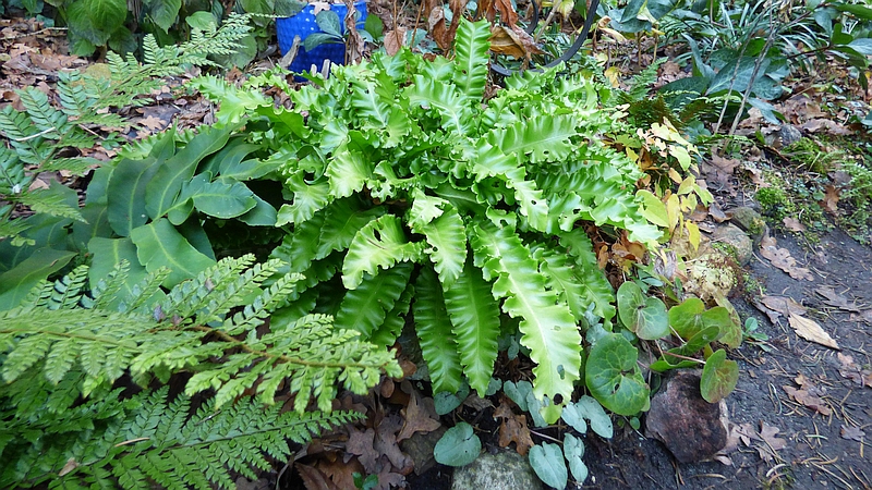 Asplenium scolopendrium 'Crispa' spędzi zimę pod liśćmi klonika palmowego, które obficie go zasypały.