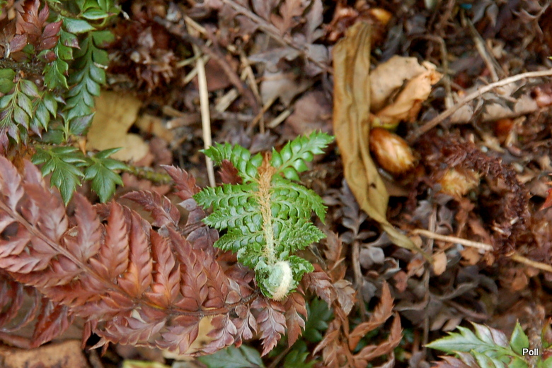 U mnie bardzo się różnią. Gatunek Polystichum neolobatum ma bardziej proste frondy, zaś Shiny Holly, sierpowate, mocno lśniące i ciemniejsze.