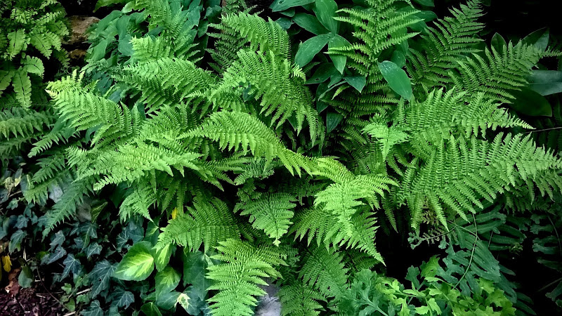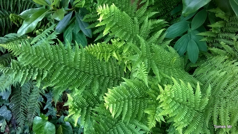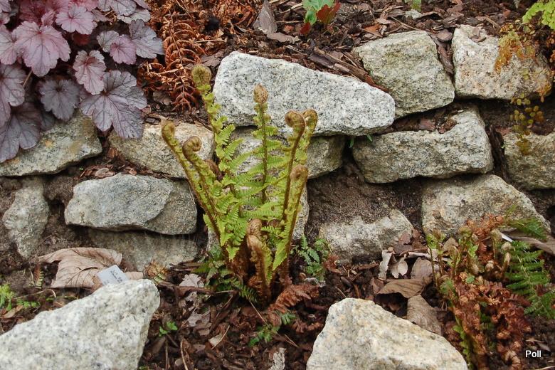 Nerecznice mocne 'Crispa' na wilgotnym stoku pod murem.