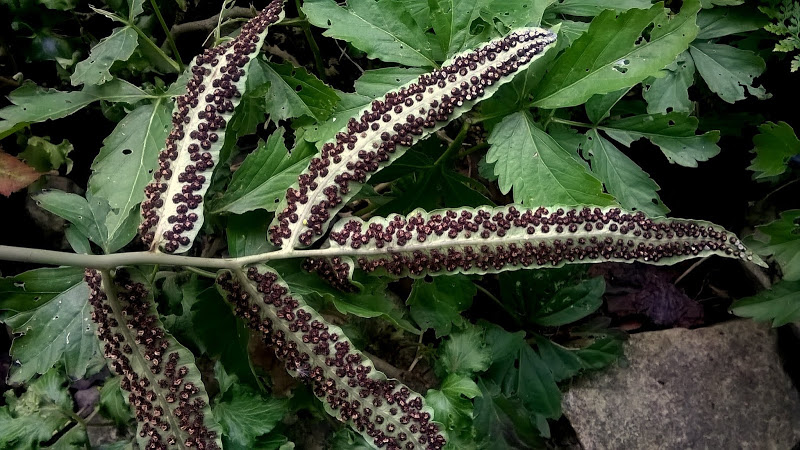 Ja jeszcze nie widziałam kępy Dryopteris sieboldii, która miałaby dużo liści - była gęsta think: To paproć, która świetnie wyglądałaby raczej zwisająca ze skał, niż rosnąca w gruncie.