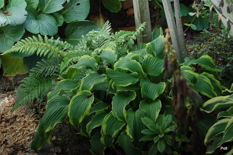 Polystichum polyblepharum w jesiennej scenerii. Hosty i inne mniej trwałe rośliny juz pożółkły a on coraz piękniejszy