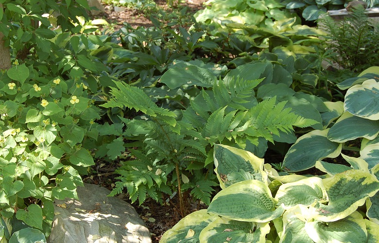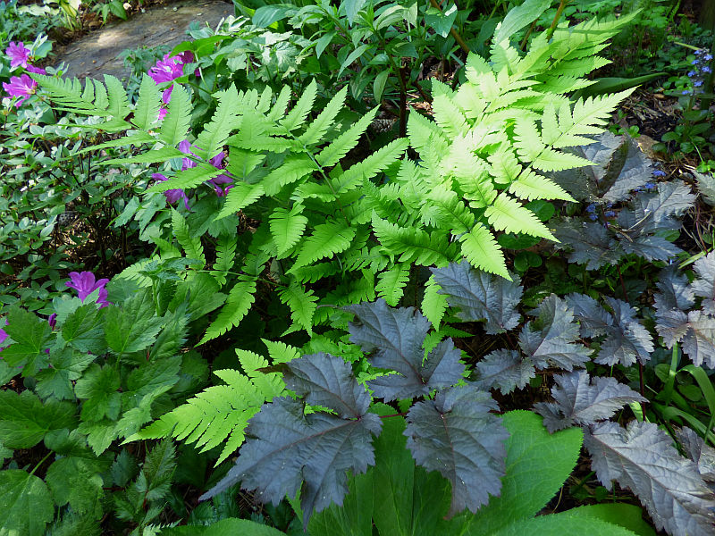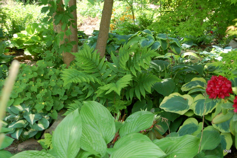 U mnie, Dryopteris goldiana rośnie w sporym zagęszczeniu wśród host, więc nie widać dobrze wyprostowanego pokroju.
