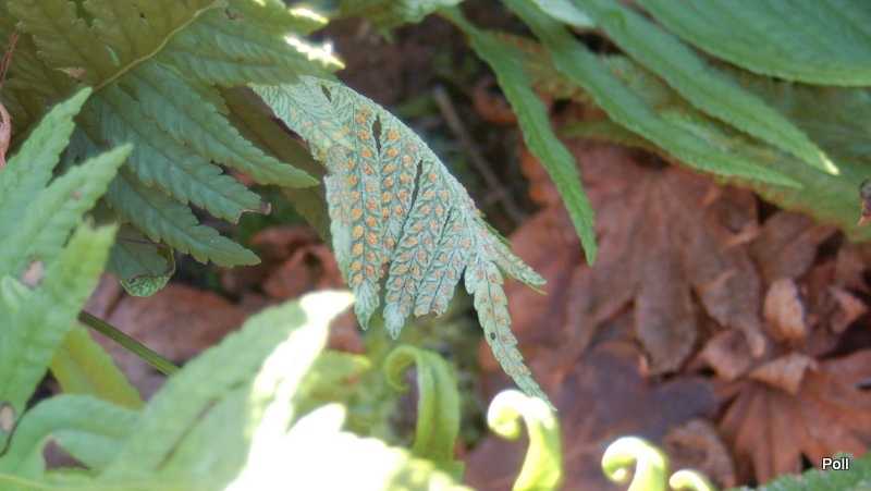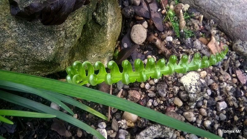Polypodium cambricum 'Oxford Gold' dwa lata temu weszło kłączem pod kamienie i w tej chwili wybija tylko z tego miejsca. Górna, głowna część prawdopodobnie obmarzła