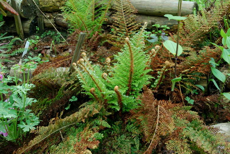 Ten paprotnik wchodzi własnie w piaty sezon. Uniknął przemrożenia, bo jest osłonięty przez mur wspierający stok paprociowy, wiec pastorały normalnie sie rozwijają