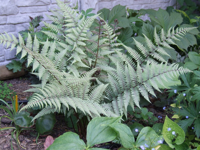 Athyrium niponicum pictum. Dodatkową ozdobą są bordowe łodygi i unerwienie, które kontrastuje z blaszka liściową Paproć dość szybko się rozrasta tworząc kępy o wysokości do