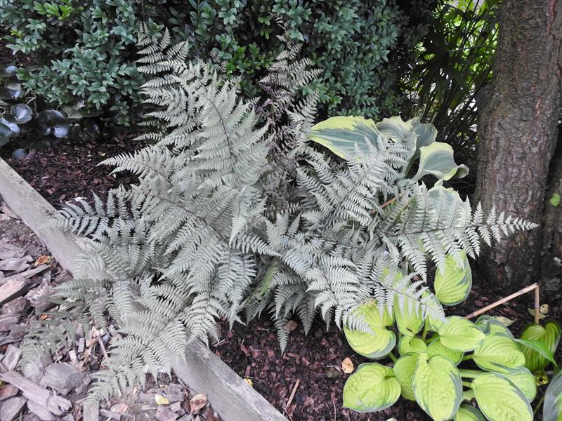 Athyrium filix-femina odziedziczyła wzniesiony pokrój, natomiast srebrzystą barwę liści po