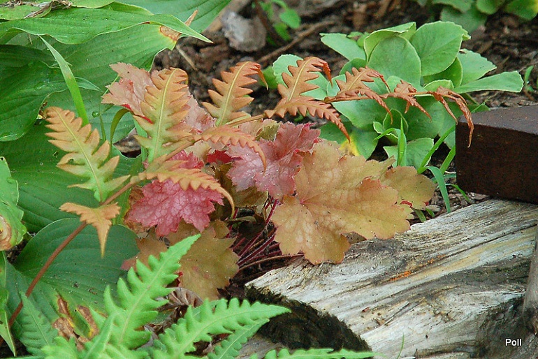 Polypodium vulgare. Rozwijajace się pastorały i młode liście mają niesamowity kolor, może on być miedziany, jasnoczerwony, pomarańczowy, czy nawet burgundowy - w zależności od wieku liścia. Tim Pynter jednak jeszcze bardziej wikła sprawę pisząc, iż tak naprawdę, w uprawie może znajdować się sporo różniących się od siebie paproci tego gatunku, gdyż różne miejsca i warunki uprawy spowodowały jego zmienność zarówno w kolorze, jak i innych cechach. Kolor młodych frondów utrzymuje się dość długo, ale z biegiem dojrzewania liści zanika, zmieniając się w soczystą zieleń.