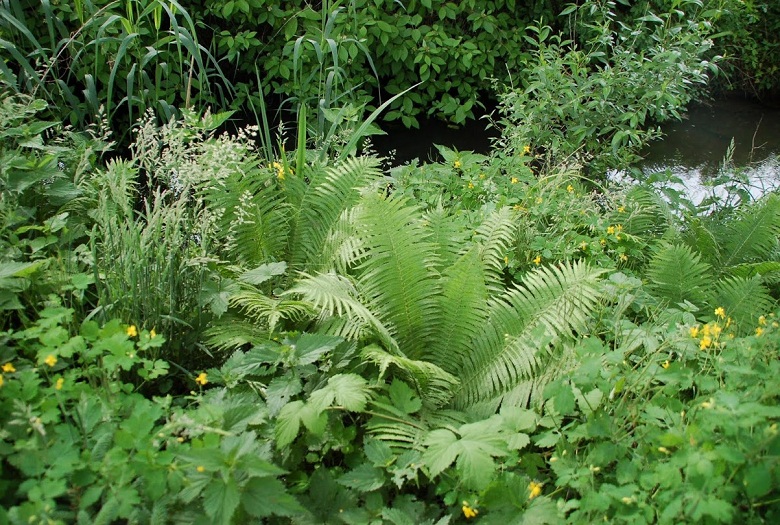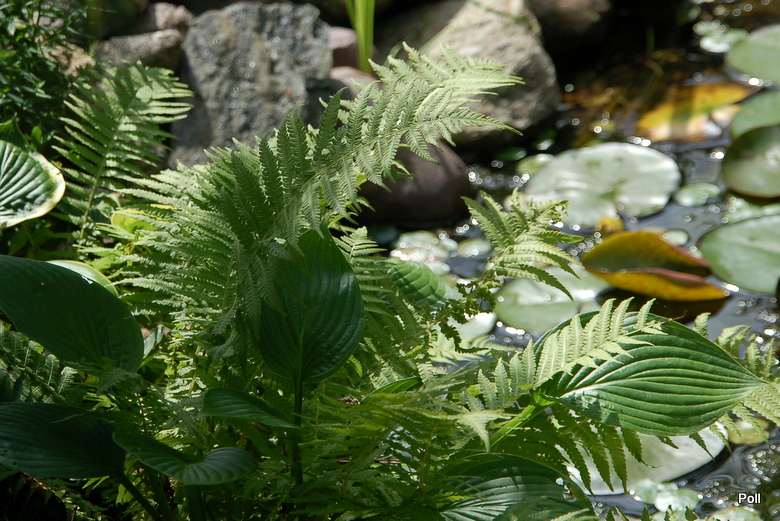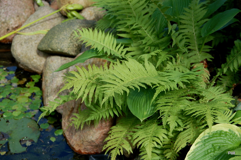 Pióropuszniki strusie na małej skarpce nad oczkiem wodnym