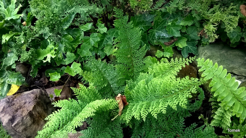 Świeże zdjęcie Polystichum setiferum 'Hamlet', sprzed dwóch dni. Niestety, nie widać, czy w końcu wyprodukował rozmnóżki. Po prawej, Polystichum retrosopaleaceum.