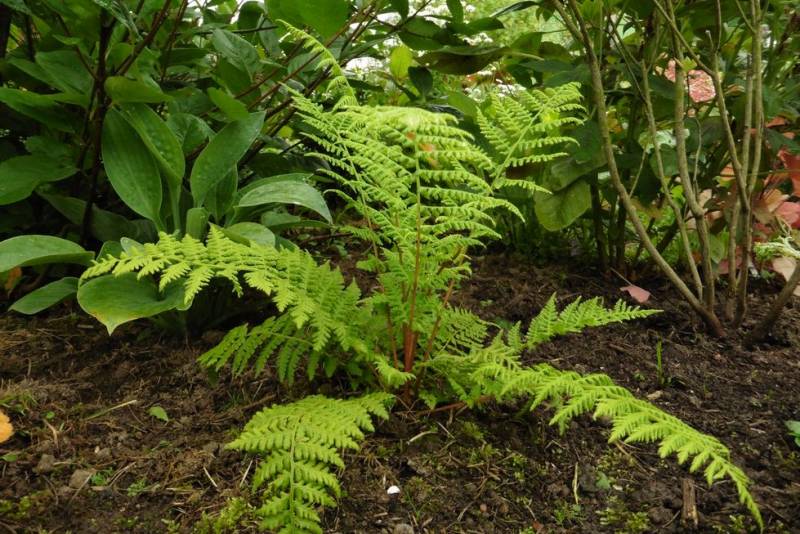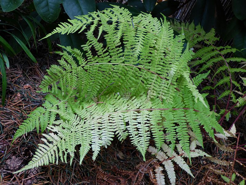 Młoda Athyrium filix-femina 'Lady in Red' na stanowisku półcienistym, zasobnym.