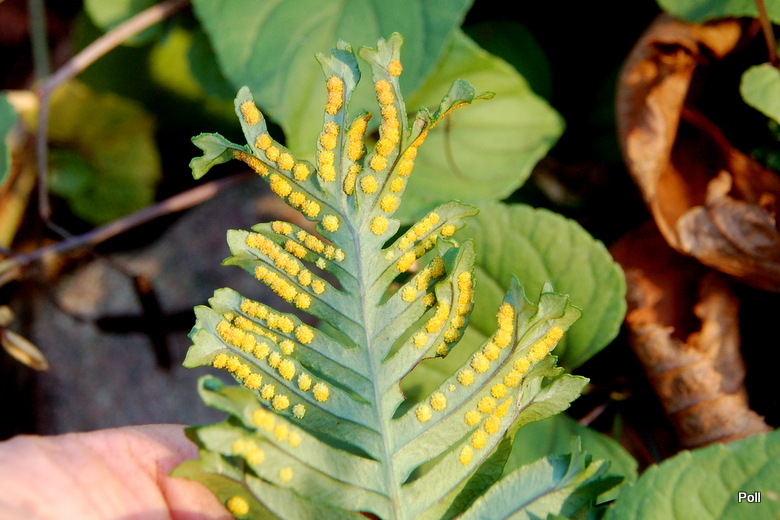 Jaskrawopomarańczowe zarodnie na backu liści sa identyczne, jak u gatunku