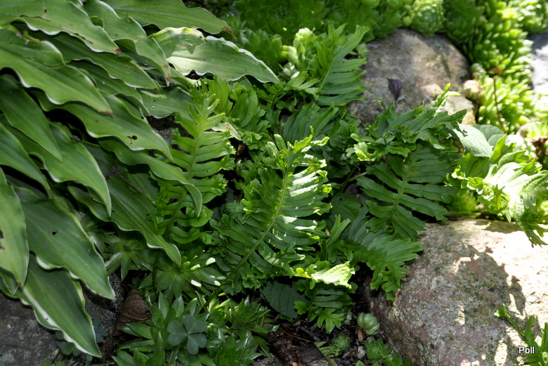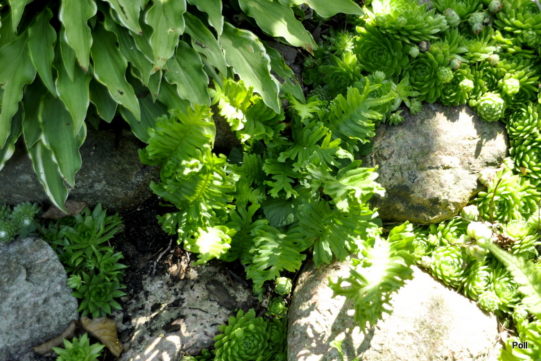 Paprotka walijska Cristatum dobrze w tym sezonie radzi sobie na suchym murku, bo...ma nieco cienia.Inne na które padają popołudniowe promienie słoneczne, mimo wilgoci pod nogami, mają zaschnięte końcówki liści i (dosłownie) wypalone brązowe dziury. Jest to pierwszy sezon, w którym dane jest mi zobaczyć paprotki w takim stanie. Własnie rozpoczęłam przenoszenie ich na inne, mniej 'parzące' miejsca. :dry: