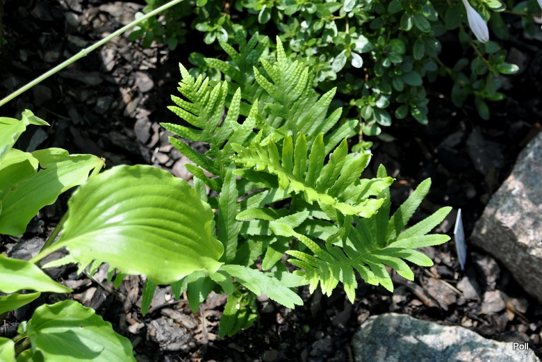 W tym sezonie wszystkie paprotki walijskie wyszły bardzo późno i bardzo opornie- myślę, że to wina upałów i susz, jakich nie ma na Wyspach Brytyjskich skąd pochodzą. Polypodium cambricum 'Carew Lane' nie jest tu wyjatkiem i dopiero nabiera rozpedu.