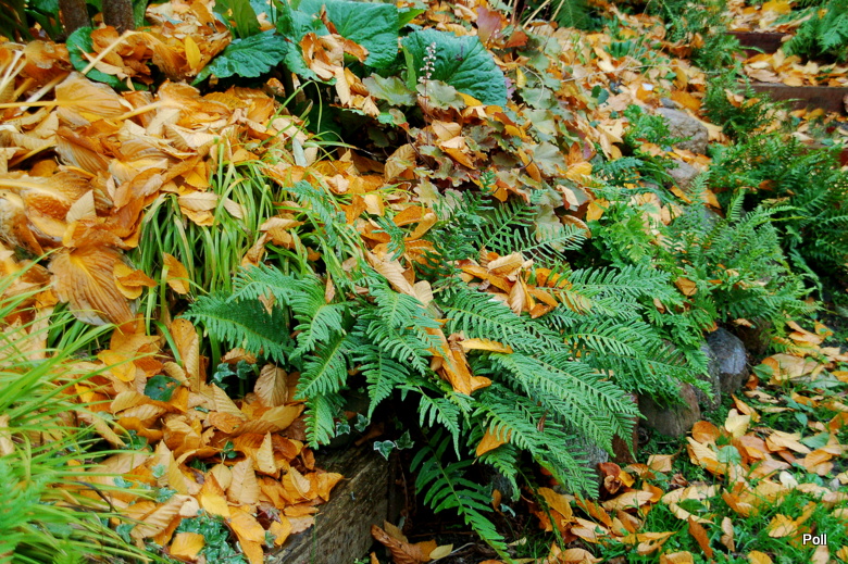 Polypodium interiectum prezentuje się pięknie nawet jesienią, zasypana opadłymi liśćmi . Jest dość wysoka, więc jej frondy sa zawsze dobrze widoczne z daleka