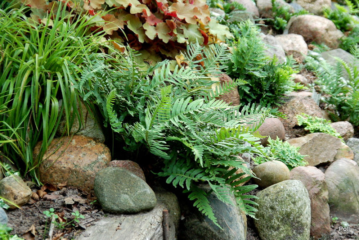 Mimo dość późnej pory, odebrałam kilka sadzonek od paprotki pośredniej i wysadziłam w różnych miejscach, które wydawały mi się kamienno-bezduszne. Uwielbiam widok paprotek zwieszających się z pomiędzy kamieni