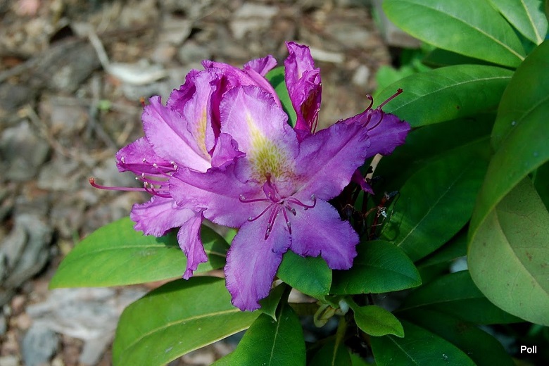 Kwiaty: purpurowo fioletowe, nieco jaśniejsze w gardzieli z wyraźną i dużą oliwkowozieloną do brązowawej plamką na górnym płatku... brzegi płatków pofalowane... średnica pojedynczego kwiatu od 7 do 8 cm... zebrane po 11-14 sztuk w szerokie, kuliste kwiatostany... nie blakną w pełnym słońcu