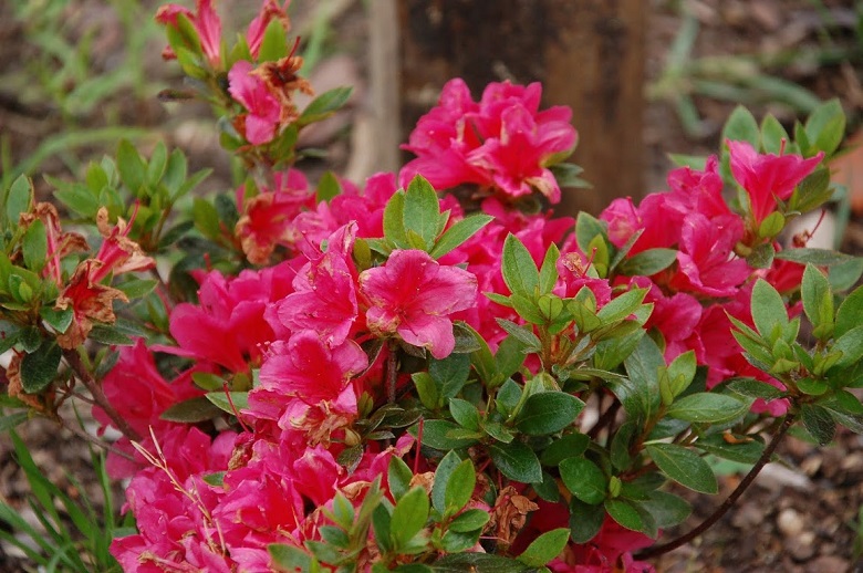 Po pięciu latach od ostatniego wpisu mogę zaraportować, że Drapa nie urosła w gorę, ale wszerz, owszem. Małe roczne przyrosty powodują, że można zaliczyć tę azalię do najwolniej przyrastających, choć ma świetne stanowisko i dostatek wody. Jak widać, kwitnie obficie i dość jaskrawo, więc mimo mikrych rozmiarów dobrze ją widać z daleka: