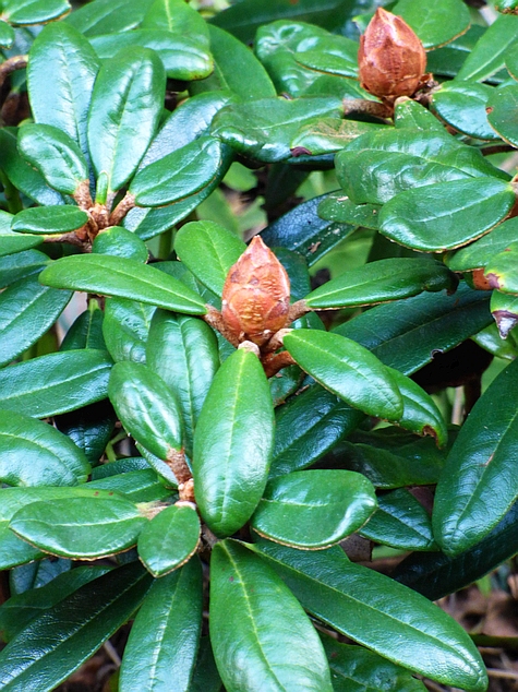 Liście: ciemnozielone i błyszczące z wierzchu, od spodu pokryte grubą, czerwonawo brązową, filcowaną wyściółką... wąsko eliptyczne do lancetowatych, wypukłe... nieduże, o długości do 7 cm przy szerokości do 2,4 cm... młode pokryte brązowo pomarańczowym kutnerem, z czasem powoli zanikającym