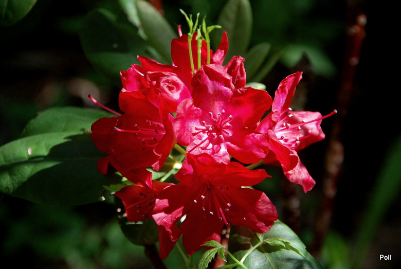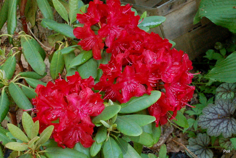 Różanecznik 'Cardinal' już rozpoczął kwitnienie i mam nadzieję, ze deszcze mu w tym nie zaszkodzą