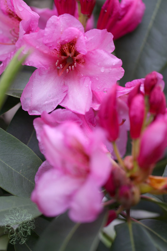 Kwiaty: w pąku różowoczerwone... po otwarciu karminoworóżowe, na brzegach nieco jaśniejsze i lekko pofalowane z licznymi cętkami zlewającymi się w wyraźną brązowozieloną plamkę na górnym płatku... lejkowate... duże, średnica pojedynczego kwiatu od 6,5 do 8 cm... zebrane po 10-12 sztuk w szerokie, płaskokuliste, wierzchołkowe kwiatostany...