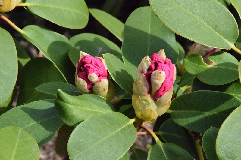 'Claudius' szykuje się do kwitnienia. Schowany za górką, nie ucierpiał od przymrozków tak, jak inne różaneczniki z grupy Williamsianum