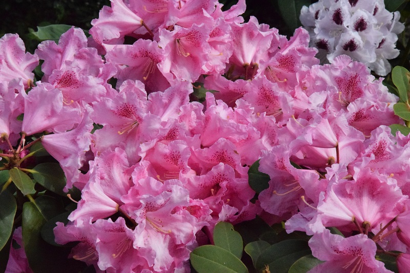 Starszy egzemplarz różanecznika 'Claudius' rozpoczął trochę później i pełnia jego kwitnienia przypadła na ostatnie deszczowe dni: