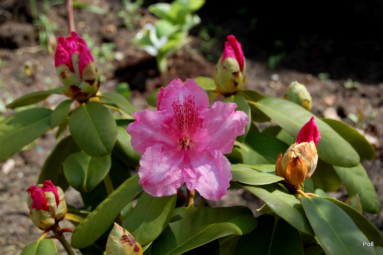 Kiedy zobaczyłam na zdjęciach różaneczniki z grupy Williamsianum, od razu przypadły mi do serca. Rododendron Claudius jest właśnie jednym z tej grupy, więc musiał znaleźć się u mnie w ogrodzie. Nie wiem jednak dlaczego, ale mimo dośc dużej mrozoodporności, nie jestem z niego zadowolona- jak i innych różaneczników Williamsa. Wiecznie wyglądają, jakby coś im brakowało, maja najbrzydsze liście z wszystkich, jakie posiadam.. Jak widzę na zdjęciu powyżej, Edytki różanecznik też nie ma pokazowych liści. :nie