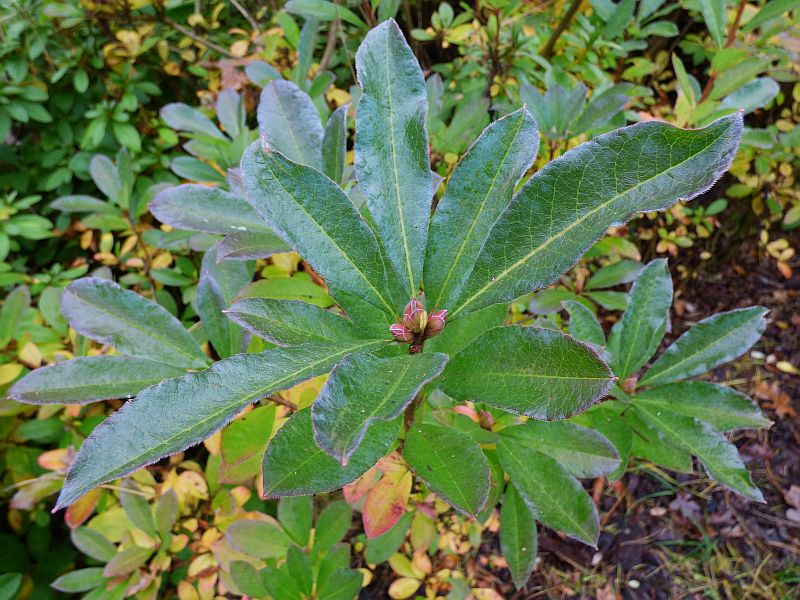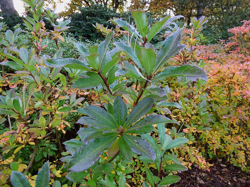 Chciałam się przekonać, czy faktycznie liście tej azalii przebarwiają się na żółto różowo... niestety... może za sprawą stanowiska ze stosunkowo niewielką ilością słońca... zwłaszcza w miesiącach jesiennych... a może też wskutek ogólnej, dramatycznie małej ilości słonecznych dni tej jesieni... 'Soir de Paris' w OB w Powsinie w październiku daleko było do jakiegokolwiek wybarwienia... niżej wprawdzie coś się nieznacznie żółciło, ale główne, młode pędy nadal były ulistnione na zielono z tym charakterystycznym niebieskawym połyskiem
