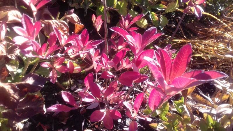 Liście: sezonowe... ciemnozielone ze srebrzysto niebieskawą poświatą, błyszczące... jesienią przybierają barwy żółto różowe do purpurowych