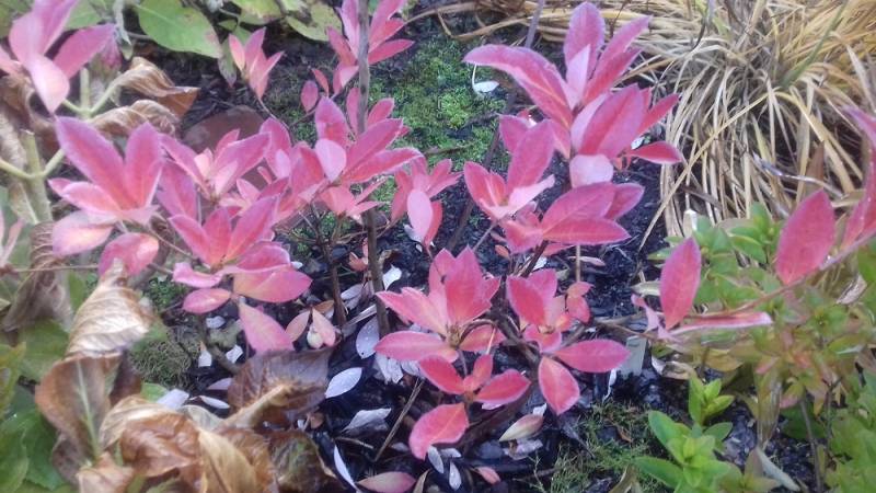 Jeżeli chodzi o jesienne przebarwienia to znalazłam jedynie takie zdjęcia. Azalia 'Soir de Paris' rośnie pierwsza z lewej na tle jałowca: