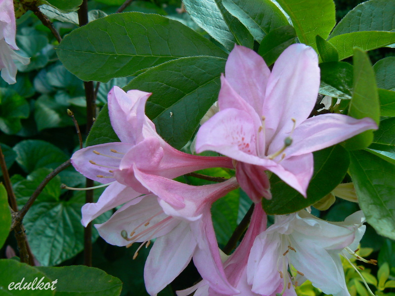 Kwiaty: w pąku różowe, po rozwinięciu bladoróżowe ze słabo zaznaczonymi, ciemnoróżowymi cętkami na górnym płatku... lejkowate... średnica pojedynczego kwiatu około 4,5 cm... zebrane po 6-8 sztuk w wierzchołkowe kwiatostany