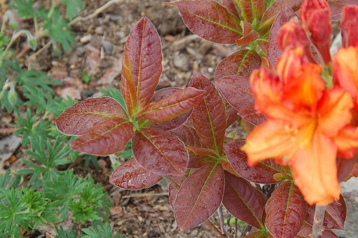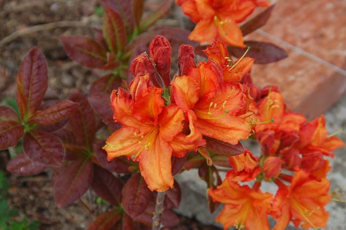 Azalia wielkokwiatowa 'Fasching' daje bardzo mocną plamę kolorystyczna, zwłaszcza, że jej młode przyrosty są ciemnej barwy. Jedna z wcześniej u mnie kwitnących... Dla porównania koloru z azaliami Klondyke.