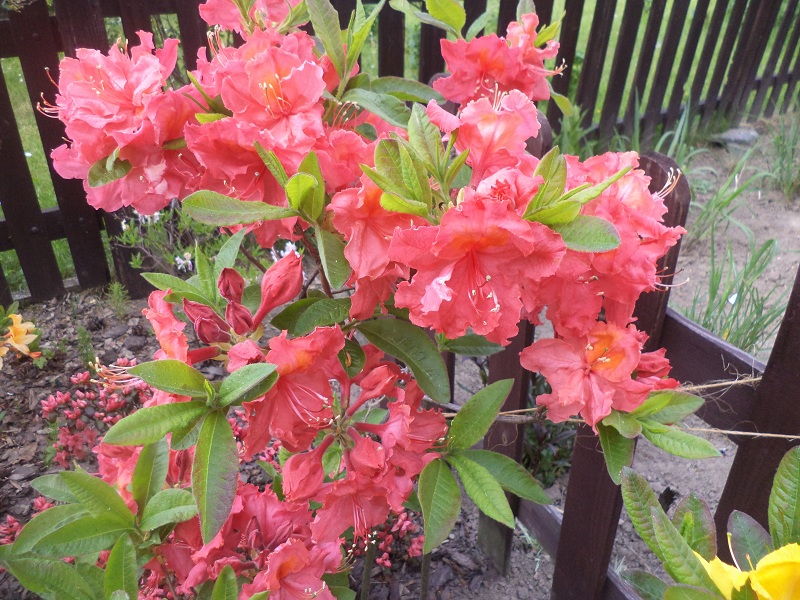 Sam krzaczek 'Sariny' jest jeszcze młody, co widać wyraźnie na portrecie grupowym.... za plecami wspaniała azalia 'Koster's Brilliant Red' :)
