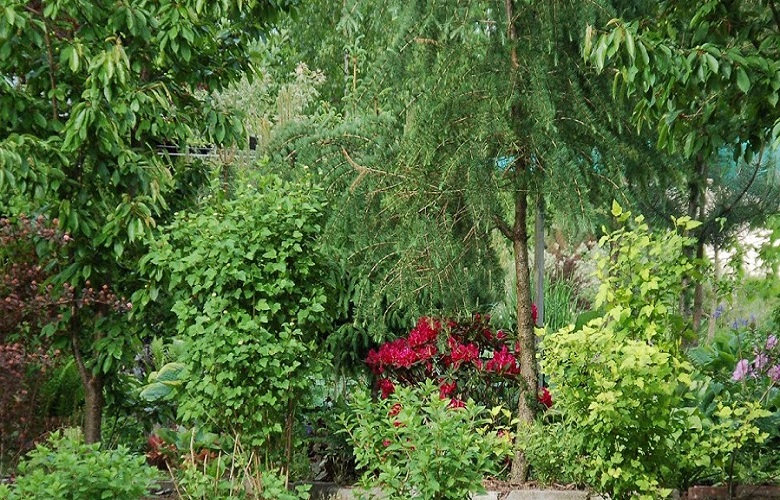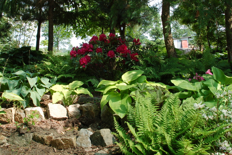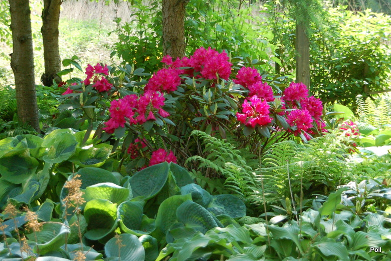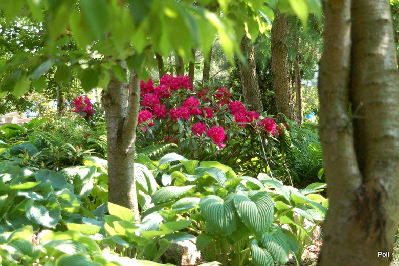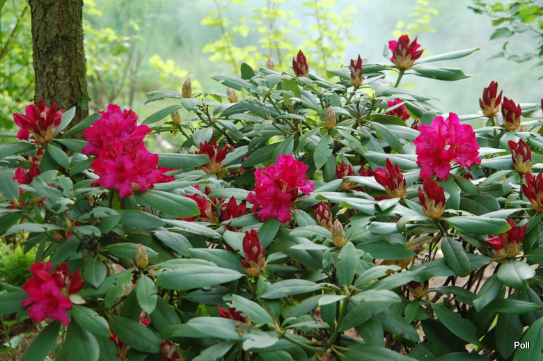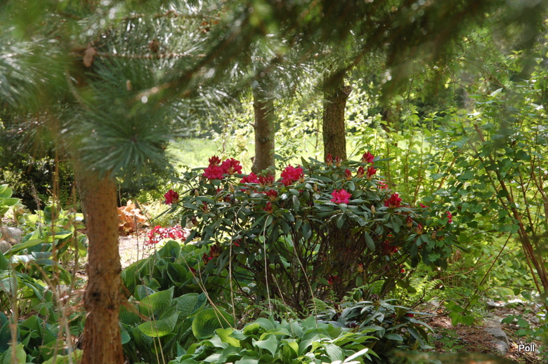 W tym roku kwitnienie różanecznika 'Mrs P. den Ouden' będzie chyba nieco słabsze. think: Gęste czereśnie będa podcinane dopiero latem, tak samo, jak modrzewie, więc stanowisko zrobi się wtedy ciut jasniejsze.