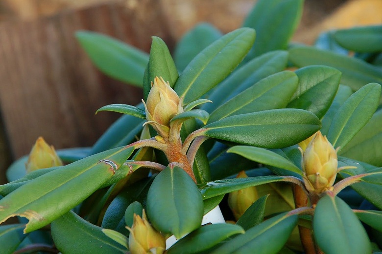 Liście: ciemnozielone, błyszczące z wierzchu, od spodu pokryte gęstą, filcowaną wyściółką... wąskoeliptyczne o spiczastym wierzchołku, lekko wypukłe... o długości do 14 cm przy szerokości do 4,6 cm