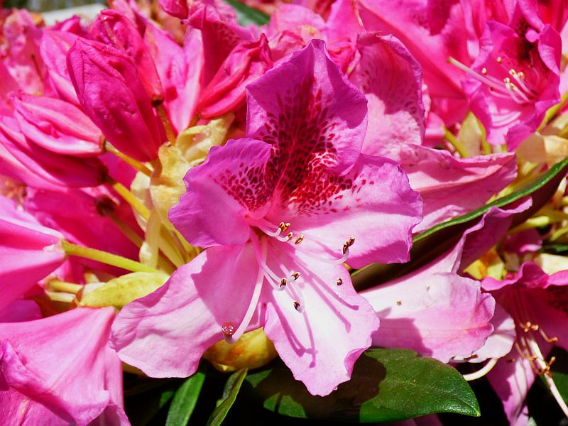 Kwiaty: w pąku intensywnie ciemnoróżowe, po otwarciu czysto różowe z wyraźną, bordowo cętkowaną plamą rozlewającą się na górnych płatkach... w miarę kwitnienia kolor blednie... brzegi płatków lekko pofalowane... lejkowate... duże, średnica pojedynczego kwiatu około 7,5 cm... zebrane po 10-18 sztuk w wierzchołkowe kwiatostany