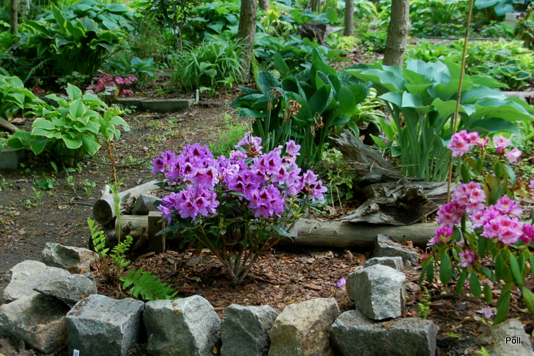 Różanecznik 'Rhododendronpark Graal-Müritz' w ogrodzie Poll ładnie kontrastuje z żółtolistnymi hostami :mniam