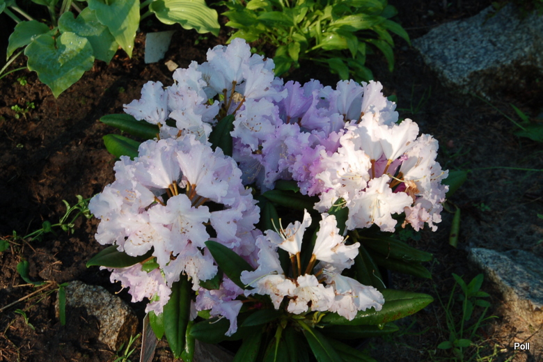 Różanecznik 'Caroline Allbrook' rosnie na naturalnie wilgotnym i zasobnym stanowisku, gdzie został przeniesiony latem ubiegłego roku w stanie niemal agonalnym - z zagrzybionymi i pożółkłymi liścmi. :blink: Szybko stanął na nogi i jak widać na zdjęciu, dośc obficie zakwitł. Słońce dochodzi do niego po południu, przez około 5 godzin i jest to wtedy całkowicie odsłonięta patelnia, bez kropelki cienia. Mam też drugi egzemplarz tego różanecznika, na Sławojkowie, ale po ubiegłorocznym wysiłku, odpoczywa. Zawiązał tylko kilka kwiatów.
