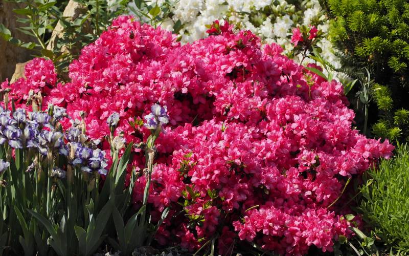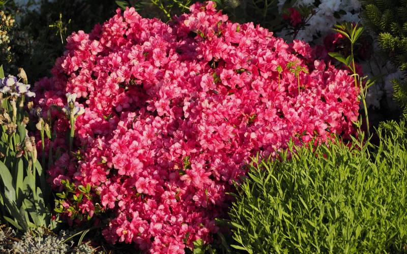 ... w głębi zupełnie zielona azalia japońska Schneeperle
