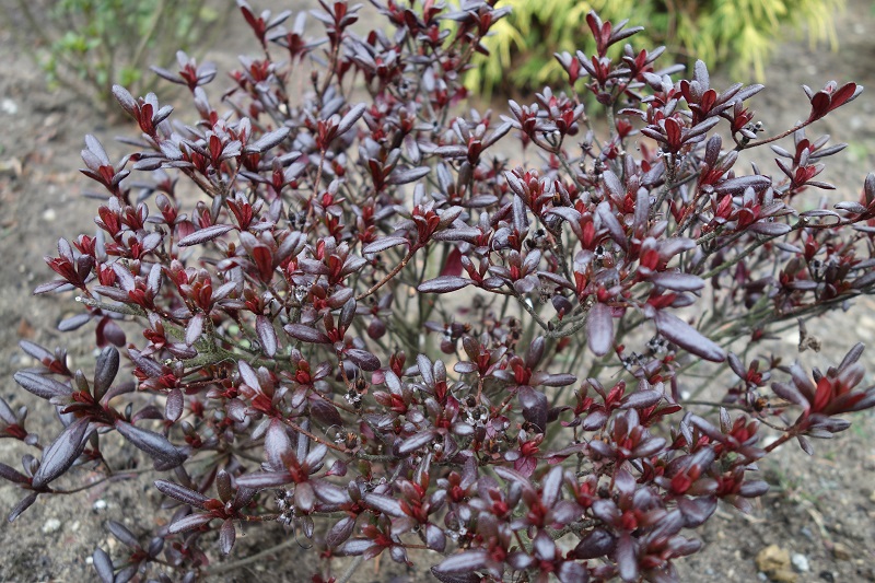 Liście: ciemnozielone o brązowym odcieniu, błyszczące... jajowate... o długości do 2,5 cm... jesienią i zimą przebarwiają się na brązowo
