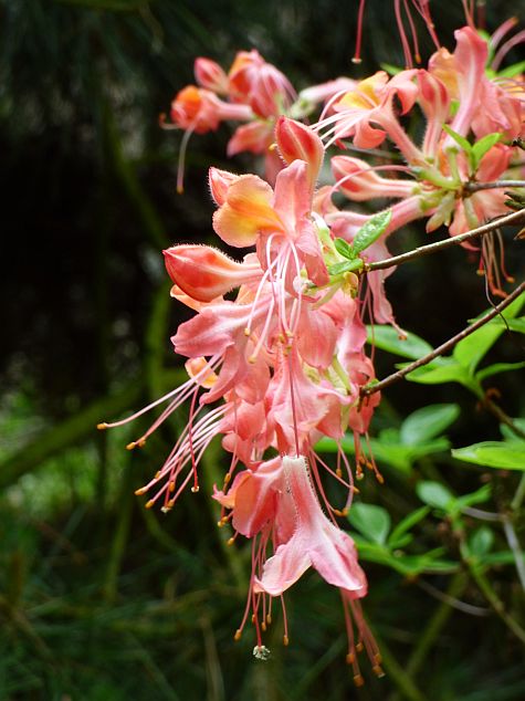 Kwiaty: żółtaworóżowe z pomarańczowożółtą plamką na górnym płatku i bardzo długimi różowymi pręcikami... rurkowato-lejkowate... średnica pojedynczego kwiatu do 6,5 cm... zebrane po 6-7 sztuk w niezbyt liczne, wierzchołkowe kwiatostany