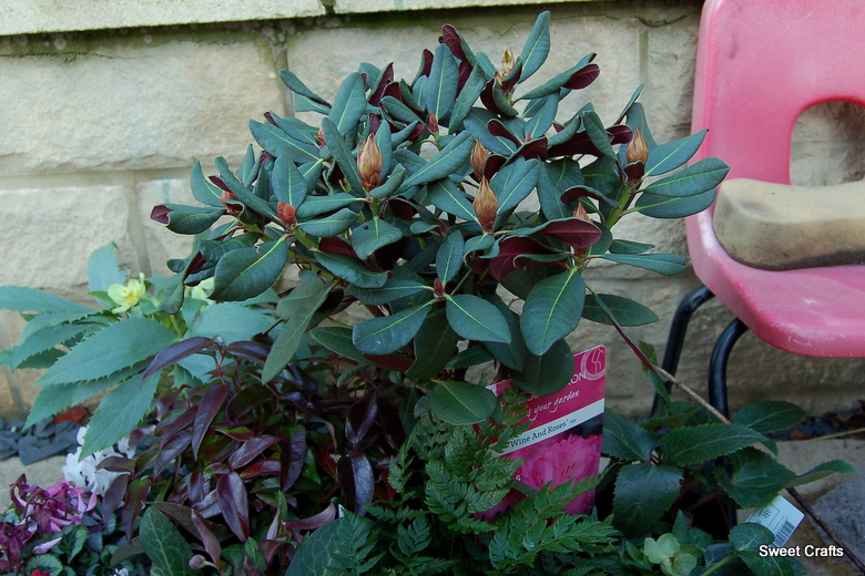 Różanecznik 'Wine and Roses' w donicy na tarasie