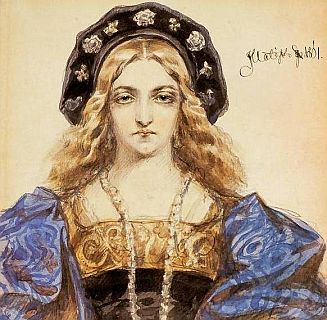 Włosy ma ślicznie jasnopłowe, kiedy (rzecz dziwna) rzęsy i brwi są zupełnie czarne. Oczy raczej anielskie niż ludzkie. Czoło pomierne i pogodne. Nos prosty beż żadnego garbu ani zakrzywienia. Lica rumiane jakby wrodzoną wstydliwością zdobne. Usta jak koral najczerwieńszy, zęby równe i nadzwyczaj białe, szyja prosta i okrągła. Pierś śnieżnej białości, ramiona najudatniejsze, rączki piękniejszej widzieć nie można. Wszystko zaś wzięte razem, czy cała figura, czy każdy członek z osobna, tworzą najśliczniejszą i najpowabniejszą całość
