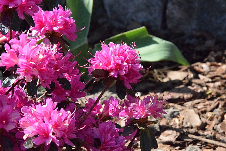 Kwiaty: intensywnie purpurowo różowe, bez rysunku... podwójne typu 'hose in hose'... lejkowate... drobne, średnica pojedynczego kwiatu do 2,3 cm... liczne, zebrane po 2-3 (do 6) sztuki na końcach pędów