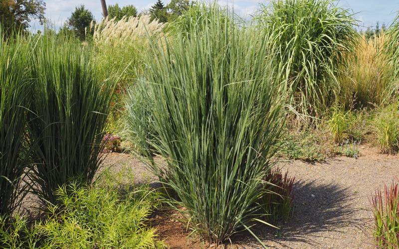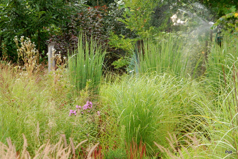 Proso 'Straight Cloud' na całkowicie słonecznym stanowisku o słabej, piaszczystej glebie (po prawej widać działający tryskacz, który leje wodę bezpośrednio na jedną z kęp)
