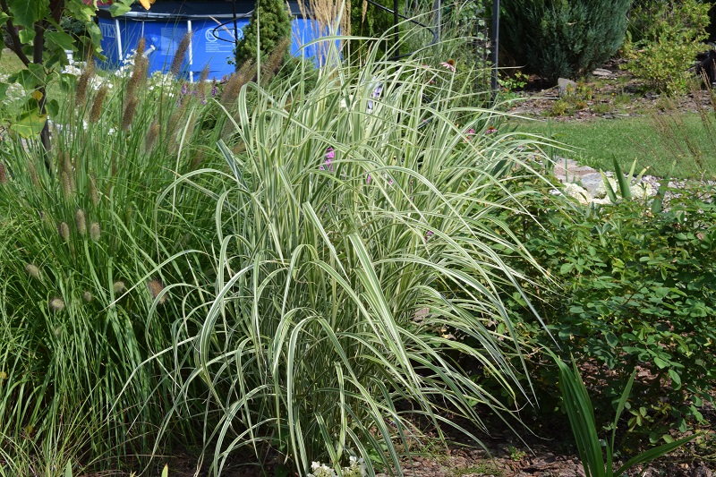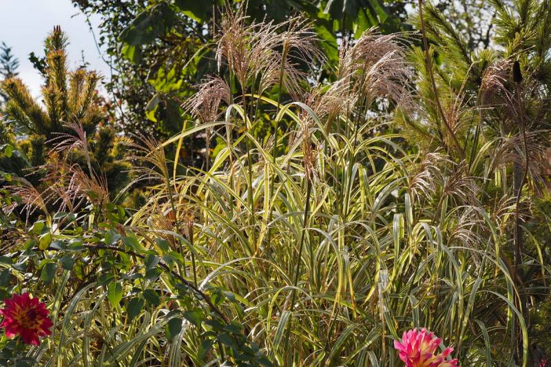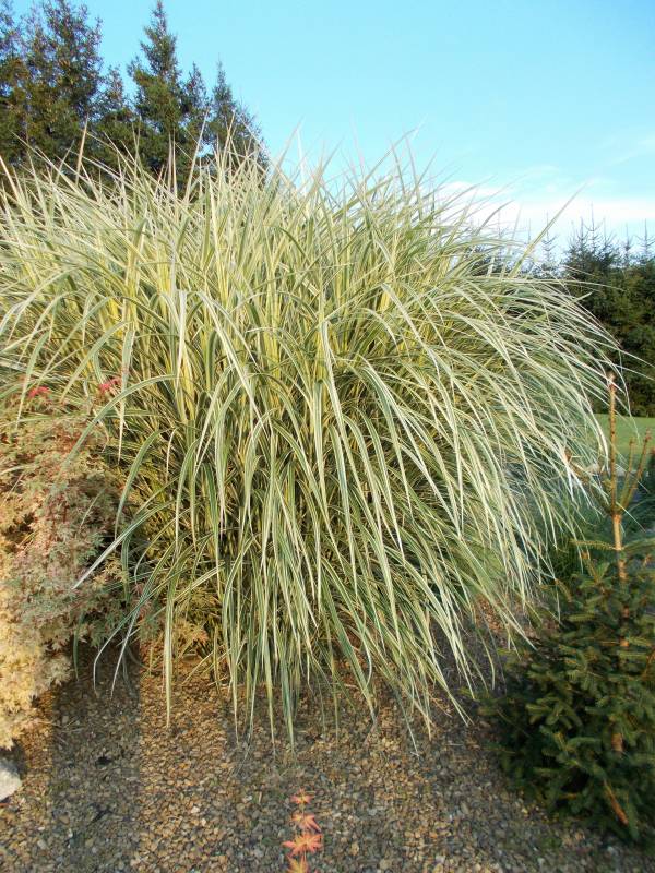 Miscanthus sinensis 'Variegatus' w ogrodzie pokazowym przy Szkółce Roślin Ozdobnych DAGLEZJA w Rykach